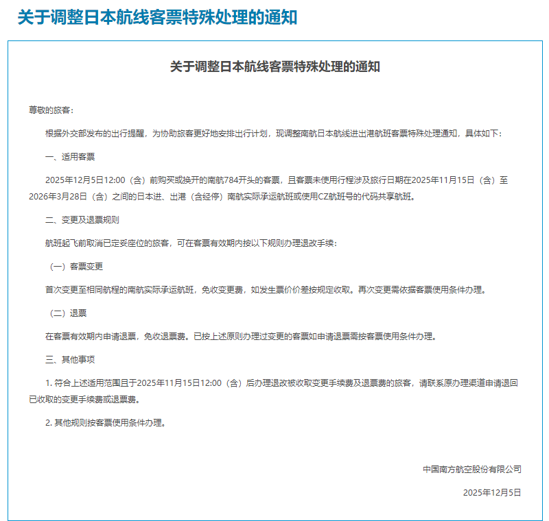 12月5日,国航、东航、南航陆续发布日本相关航线客票特殊处理的通知,2026年3月28日(含)前出行的涉及日本进港、出港或经停航班可免费退改。在此之前,免费退改签政策到2025年12月31日结束。