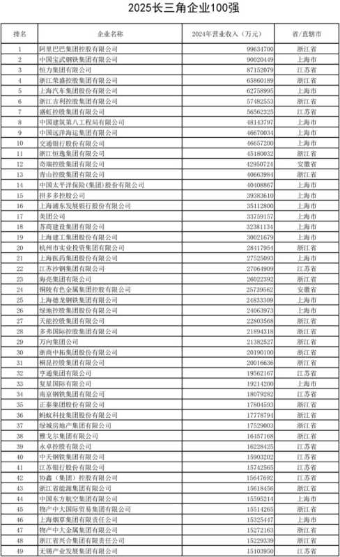 2025长三角百强企业榜单揭晓:民企表现亮眼
