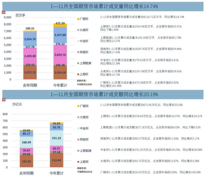 从各家期货交易所的成交情况来看,1—11月,上期所累计成交量为20.35亿手,累计成交额为216.64万亿元,同比分别下降1.8%和增长16.57%;上期能源累计成交量为1.45亿手,累计成交额为27.18万亿元,同比分别增长12.37%和下降6.52%;郑商所累计成交量为28.30亿手,累计成交额为80.57万亿元,同比分别增长17.42%和2.17%;大商所累计成交量为23.58亿手,累计成交额为93.70万亿元,同比分别增长14.75%和5.08%;中金所累计成交量为2.77亿手,累计成交额为231.32万亿元,同比分别增长21.39%和36.88%;广期所累计成交量为4.72亿手,累计成交额为26.03万亿元,同比分别增长161.99%和159.36%。