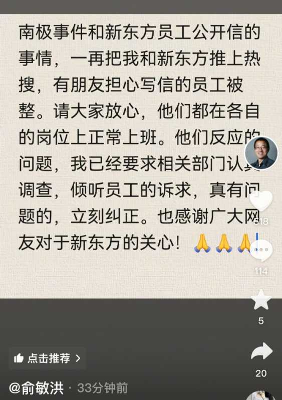 12月6日,新东方创始人俞敏洪发文表示,针对“南极事件和新东方员工公开信”引发关注,他称写信员工都在正常上班,已要求相关部门认真调查员工诉求,真有问题的将立刻纠正。
