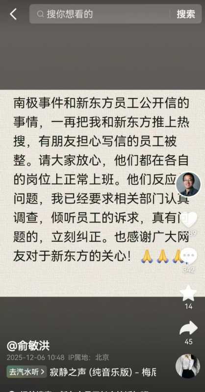 12月6日,新东方集团董事长俞敏洪发文称,南极事件和新东方员工公开信的事情,一再把我和新东方推上热搜,有朋友担心写信的员工被整。请大家放心,他们都在各自的岗位上正常上班。他们反映的问题,我已经要求相关部门认真调查,倾听员工的诉求,真有问题的,立刻纠正。