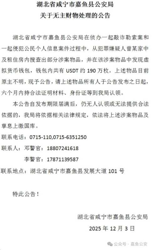 财联社12月6日讯,近日,湖北咸宁市嘉鱼公安发布公告,寻找一笔涉敲诈勒索案的虚拟货币原主人,虚拟货币钱包内共有USDT币约190万枚。