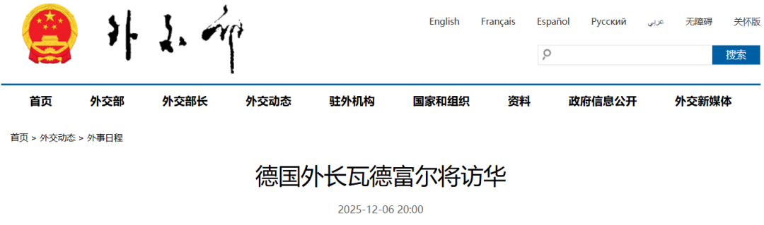 应中共中央政治局委员、外交部长王毅邀请,德国外长瓦德富尔将于12月8日至9日访问中国,此举旨在加强中德外交关系。