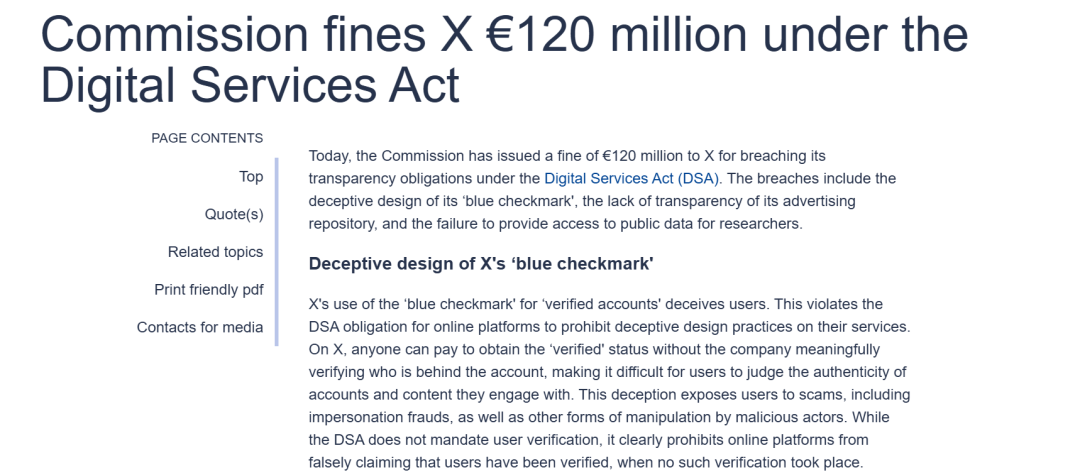 根据公报,处罚X有三个原因:X的“蓝标认证”仅通过付费即可获得,在界面设计上对用户具有误导性;X的广告资料库在透明度和可访问性方面均不合规;X未按规定向符合条件的研究人员开放平台公共数据访问权限。