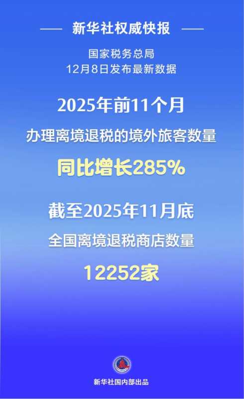 今年前11个月,国家税务总局公布数据显示,办理离境退税的境外旅客数量同比增长285%,退税商品销售额和退税额同比增长98.8%。截至11月底,全国离境退税商店已达12252家,提供“即买即退”服务的商店超7000家,退税服务持续优化。