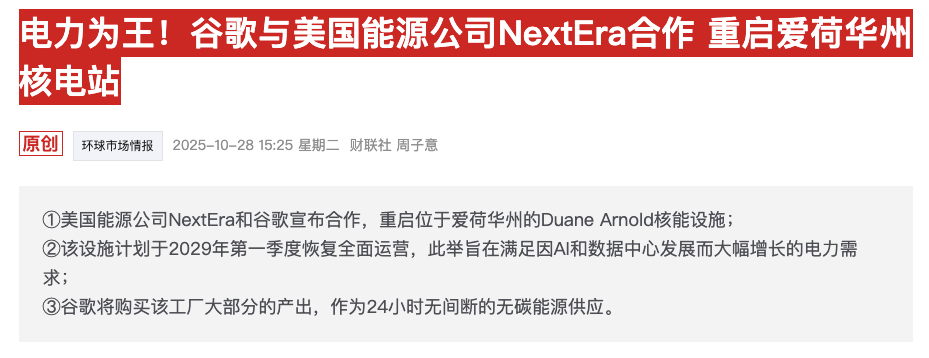 全球市值最高电力股新纪元能源(NextEra Energy)周一连发两条公告,官宣与科技巨头谷歌、Meta在AI、电力领域的最新合作。