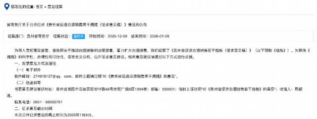 12月9日,南都湾财社-酒水新消费指数课题组记者从贵州省商务厅注意到,该部门发布了《贵州省促进白酒销售若干措施(征求意见稿)》(下称“征求意见稿”),并对外征求意见。该征求意见稿主要有十条,内容涵盖线上促销、打造消费场景、激活宴席及鼓励白酒与金融机构深化合作等多项内容,征求意见截止日期为2026年1月9日。
