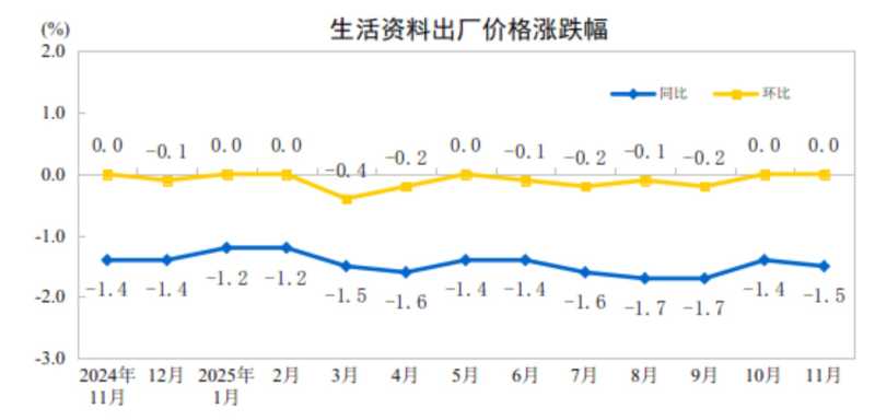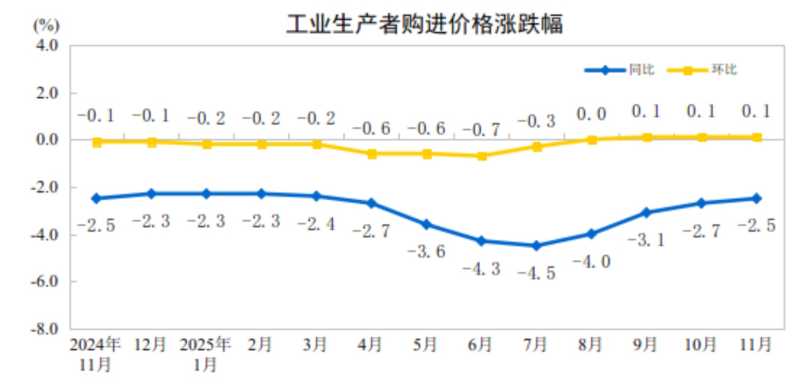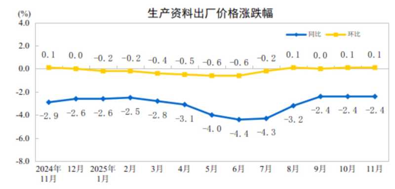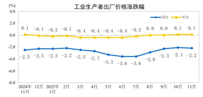 国家统计局最新数据显示,2025年11月份全国工业生产者出厂价格同比下降2.2%,购进价格同比下降2.5%。详细数据揭示生产资料与生活资料价格的变动情况。