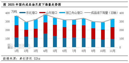 卓创资讯统计显示,2025年11月,东北地区港口、山东地区港口以及浙江舟山港口成品油船运下海量在329.33万吨,环比上涨13.34%,相比上月环比止跌反弹,且结束连续两月环比下降的态势,同比上涨幅度在29.67%,实现环比以及同比双双上涨,成品油船运内贸市场活跃度好转。