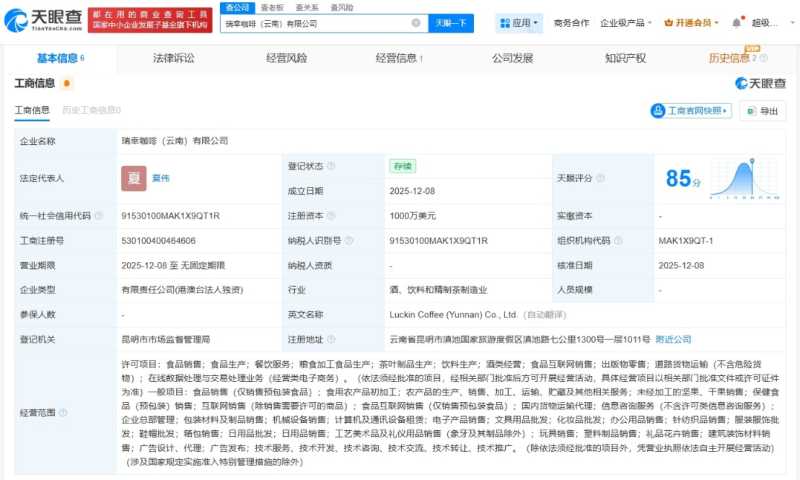 天眼查App显示,瑞幸咖啡(云南)有限公司近日成立,注册资本1000万美元,经营范围包括食品销售、食品生产等。