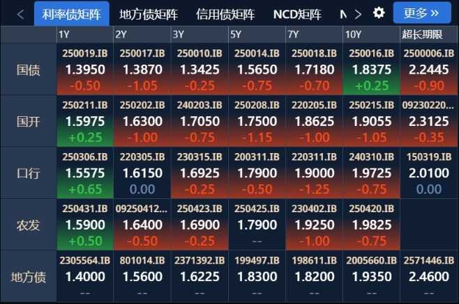 从1年期到超长期国债品种,收益率当日均实现1bp以内的小幅下行。国开债、口行债和农发债则呈现分化格局,短端品种表现偏弱,中长端品种则出现小幅上涨。