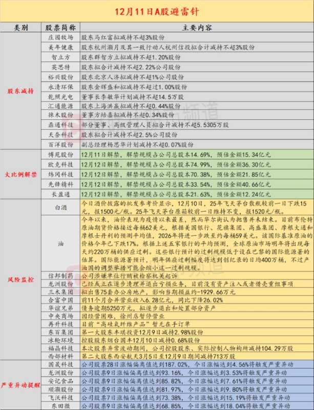 导读:近日,A股及海外市场潜在风险事件如下。国内经济信息方面包括:1)茅台回归指导价,25年飞天散瓶批价跌至1500元;2)2026年揽储“开门红”氛围不似往年“火热”。公司方面重点关注包括:1)信邦制药公告,公司涉嫌单位行贿被检察机关起诉;2)6连板龙洲股份表示,已经或正在逐步清理并退出亏损业务,目前没有资产注入或者借壳重组事项。海外市场重点关注包括:1)华尔街认为原油抛售远未结束,明年将因供应过剩而继续下跌;2)美国就业成本增长速度降至2021年中以来最低。