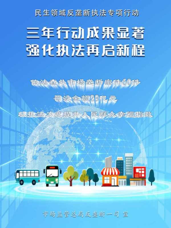 自2023年市场监管系统开展民生领域反垄断执法专项行动以来,依法查处市场垄断案件60件,罚没金额29亿元,维护公平竞争的市场秩序。