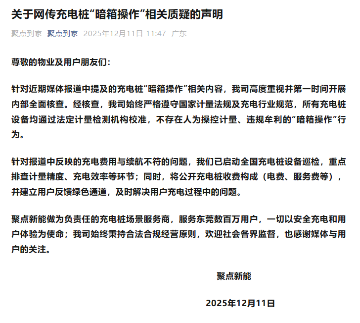 12月11日,充电运营商聚点新能发布《关于网传充电桩“暗箱操作”相关质疑的声明》,称针对近期媒体报道中提及的充电桩“暗箱操作”相关内容,公司高度重视并第一时间开展内部全面核查。经核查,公司始终严格遵守国家计量法规及充电行业规范,所有充电桩设备均通过法定计量检测机构校准,不存在人为操控计量、违规牟利的“暗箱操作”行为。