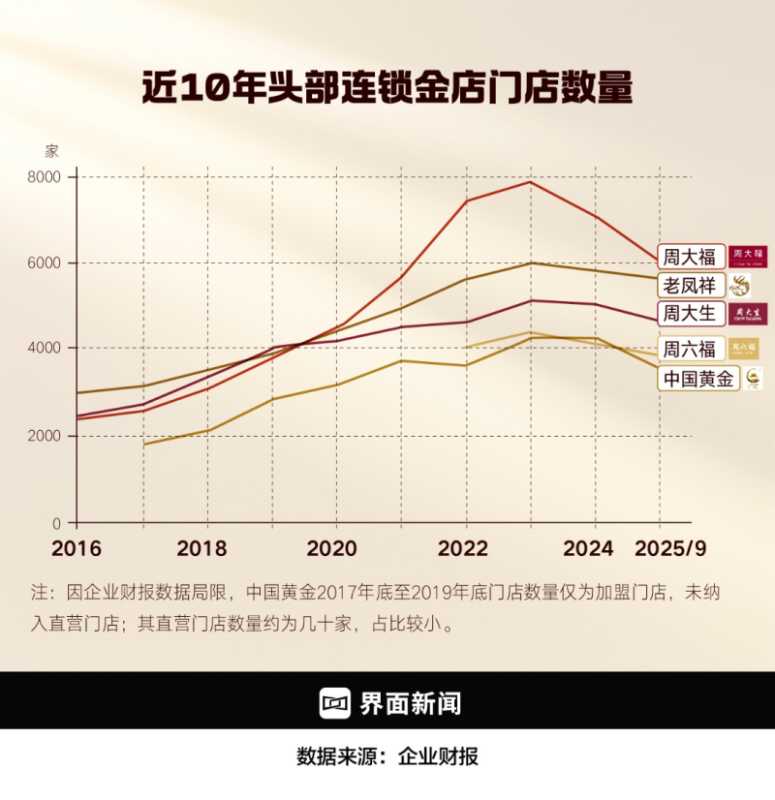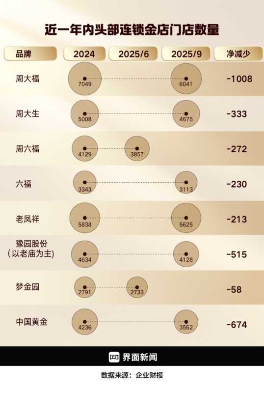 参考拥有2000家以上门店的黄金珠宝上市公司,2025年前9个月,仅这些大公司总共就关停了至少3303个销售点。更别提还有那些开在县城乃至乡镇的个体户金店。如果去这些地方的步行街走上一圈会发现,曾经人头攒动的金铺不少都变得门庭冷清,很多金店则已经摘下了招牌。
