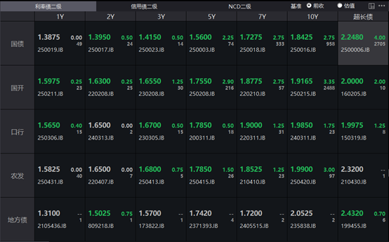 具体来看,银行间主要利率债收益率大幅上行,截止北京时间16:30,10年期国债活跃券250016收益率上行2.75bp报1.8425%,30年期国债活跃券2500006收益率上行4bp报2.248%,10年期国开活跃券250215收益率上行3.35bp报1.9165%。