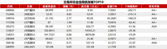 交易所债券市场收盘,据Choice 数据统计显示,今日交易所市场非金信用债涨幅排行前五的分别是:24产融08、20双龙01、22万科06、23产融K1、22龙湖02。具体如下: