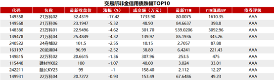 据Choice 数据统计显示,今日交易所市场非金信用债跌幅排行前五的分别是:21万科02、21万科06、23万科01、21万科04、24舟城02。具体如下:
