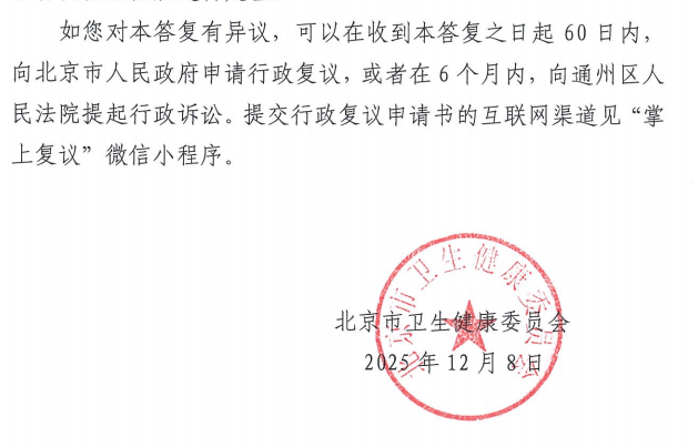 12月13日,红星资本局从张晓玲处获悉,针对她发起的投诉,北京市卫健委做出了答复意见书。