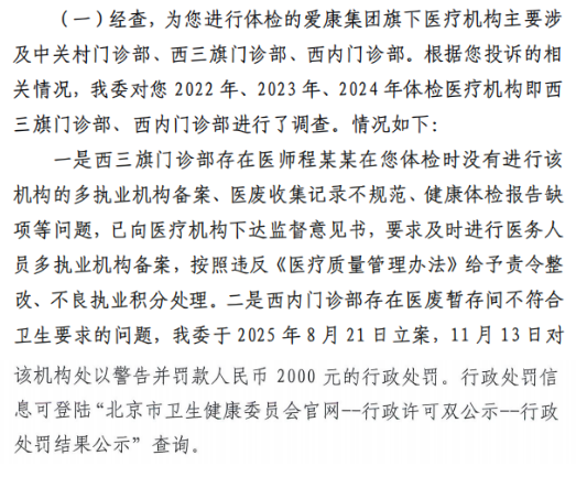 爱康国宾被曝体检事件新进展:两门店违规被罚