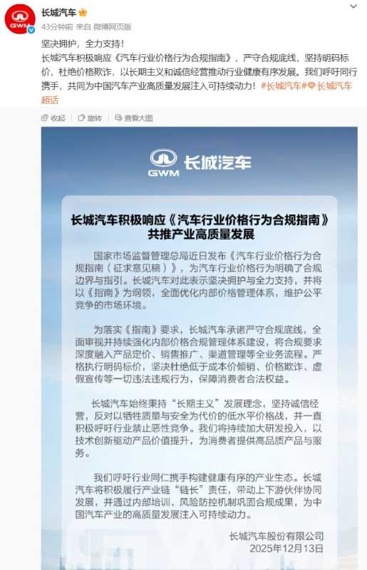 同日,长城汽车发文称,积极响应《汽车行业价格行为合规指南》,严守合规底线,坚持明码标价,杜绝价格欺诈,以长期主义和诚信经营推动行业健康有序发展。长城汽车承诺严守合规底线,全面审视井持续强化内部价格合规管理体系建设,将合规要求深度融入产品定价、销售推广,渠道管理等全业务流程。严格执行明码标价,坚决杜绝低于成本价倾销、价格欺诈、虚假宣传等一切违法违规行为,保障消费者合法权益。