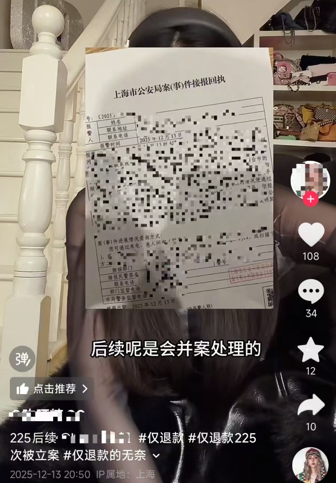 不止如此,除时女士外,有其他商家表示,自己也遭到了这名“顾客”的“仅退款”。上海的一位服装店店主刘女士发视频声援时女士,称自己也被以同样手法诈骗。