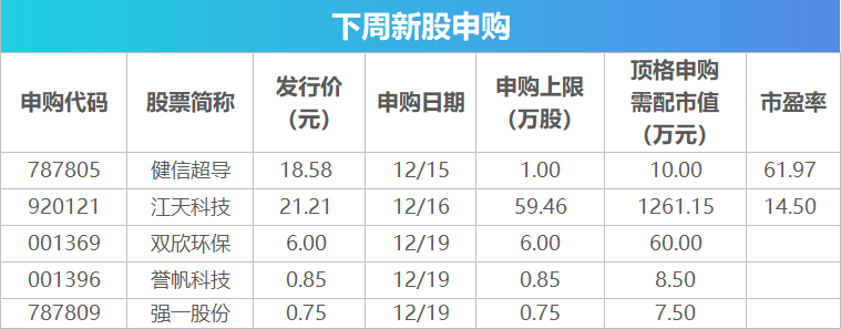 Wind数据显示,下周将有5只新股申购,其中深市主板2只、沪市科创板2只,北交所1只。具体来看,12月15日发行的是健信超导,12月16日发行的是江天科技,12月19日发行的是强一股份、誉帆科技、双欣环保。
