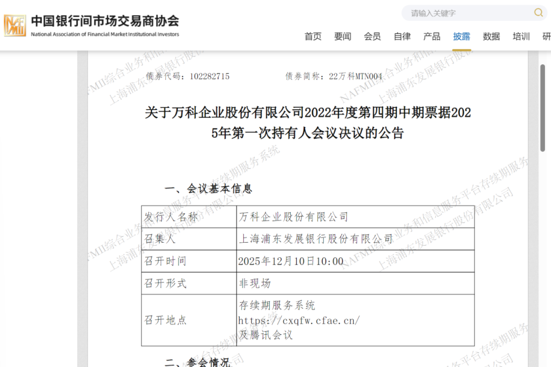 同时,为稳妥推进本期中期票据本息兑付工作,万科拟于2025年12月18日召开2022年度第四期中期票据2025年第二次持有人会议,对本期债券展期相关事项进行审议。