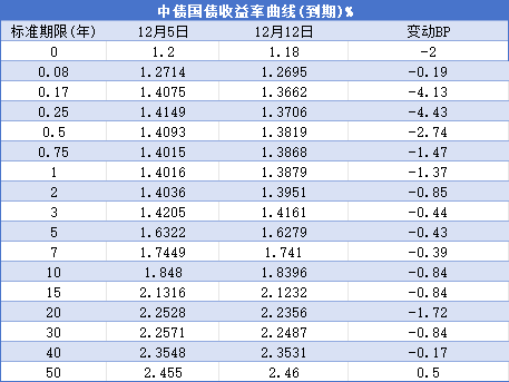 2025年12月12日,中债国债到期收益率1年期、2年期、3年期、5年期、7年期、10年期、30年期、50年期较2025年12月5日分别变动-1.37BP、-0.85BP、-0.44BP、-0.43BP、-0.39BP、-0.84BP、-0.84BP、0.5BP。
