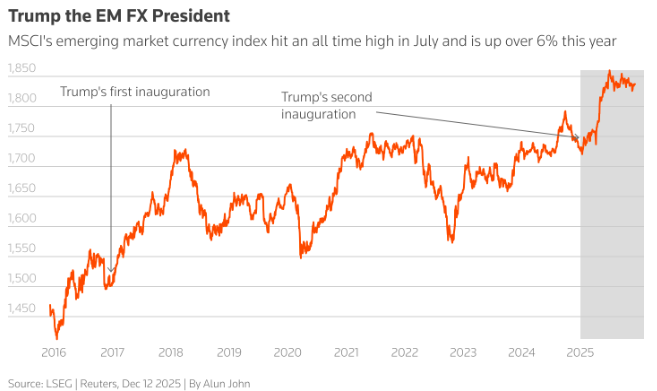 更广泛的新兴市场货币标杆同样表现亮眼:MSCI新兴市场货币指数在今年7月曾创下历史新高,年内迄今涨幅已超6%,有望创下2017年以来最佳年度表现。交易员、基金经理和分析师普遍预期,这一趋势明年还将延续。
