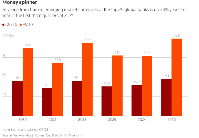 研究机构Vali Analytics整理的数据则显示,新兴市场货币交易今年作为银行的摇钱树,为其带来了可观收益——全球前25大银行在今年前九个月通过新兴市场货币交易创收近400亿美元,创历史最佳表现。