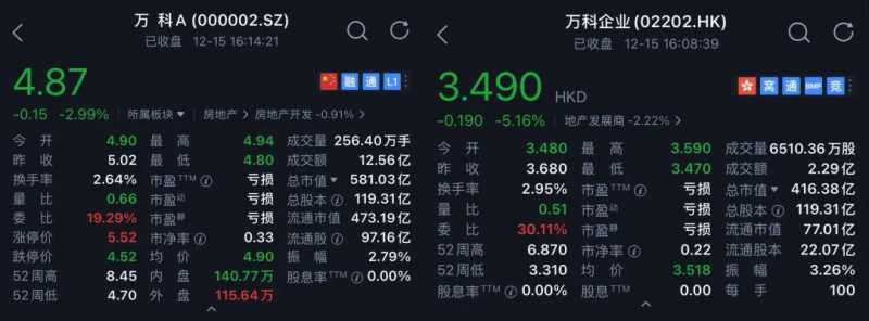 截至收盘,万科A(000002)跌近3%,报收4.87元;万科企业(02202.HK)跌5.16%,报收3.49港元。
