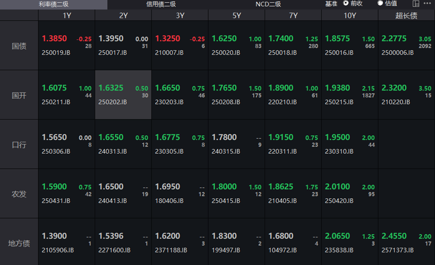 银行间主要利率债收益率全线上行,10年期国债活跃券250016收益率上行1.5bp报1.8575%,10年期国开债活跃券250215收益率上行2.15bp至1.938%,30年期国债活跃券2500006收益率上行3.05bp至2.2775%。