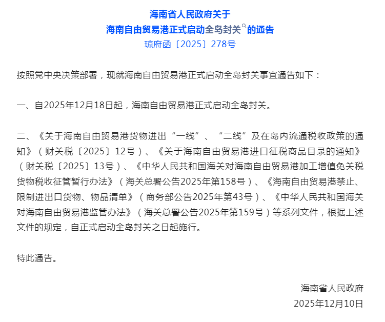 12月16日,海南省人民政府发布通告,自2025年12月18日起,海南自由贸易港正式启动全岛封关。