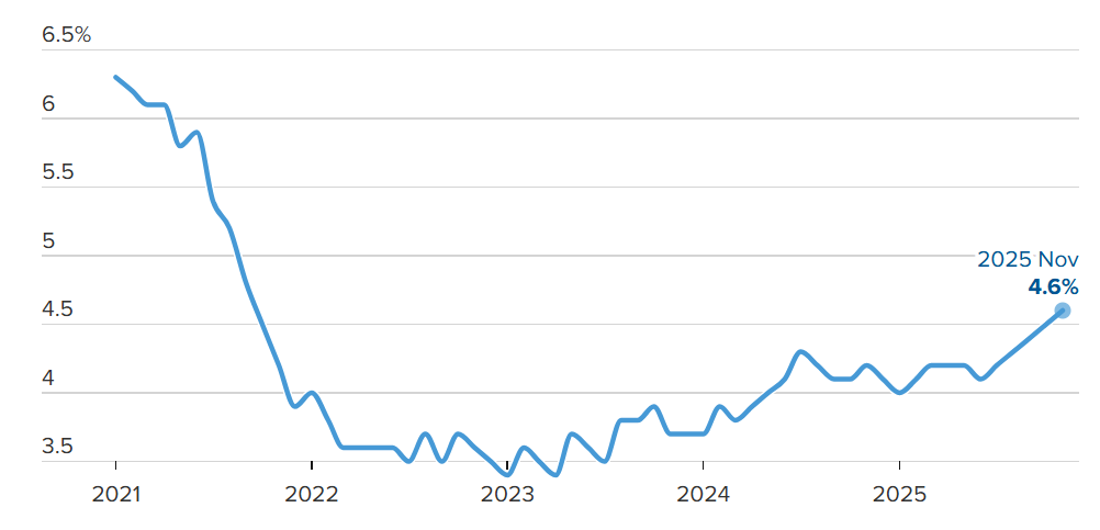 就业和通胀数据是美联储货币政策制定的关键指标。在最近一次会议上,美联储将基准利率下调了25个基点,但暗示进一步降息的门槛更高。自9月以来,美联储已连续三次降息,将基准基金利率降至3.5%—3.75%的目标区间。