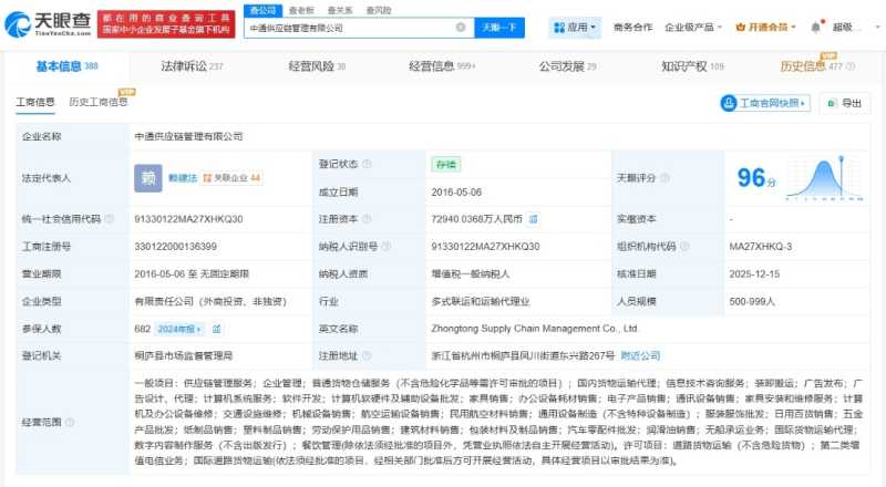 中通供应链管理有限公司注册资本增至约7.3亿元人民币