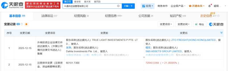 中通供应链管理有限公司近日发生工商变更,注册资本由约6亿元人民币增至约7.3亿元人民币,增幅约21%。该公司经营范围包括供应链管理服务、企业管理等。