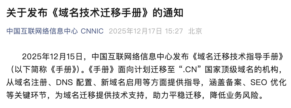 12月15日,中国互联网络信息中心发布《域名迁移技术指导手册》,该手册为计划迁移至.CN域名的机构提供全面的技术支持,包括域名注册、DNS配置等关键环节,旨在助力平稳迁移并降低业务风险。