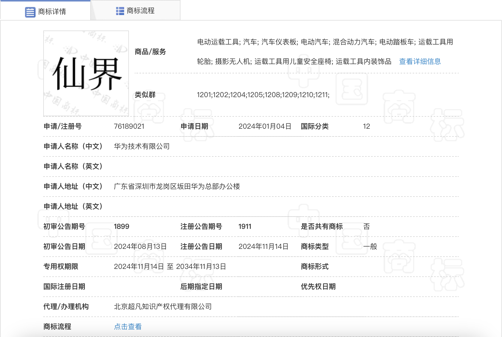 2024年11月21日,国家知识产权局商标局官网披露,华为已成功注册“仙界”“天界”“君界”“峥界”等多个商标,这些商标均隶属于国际分类12,覆盖电动运载工具、汽车及其相关衍生产品范畴。以“仙界”商标为例,其申请日期追溯至2024年1月4日,历经数月审核,终于在11月14日正式注册成功,有效期将持续至2034年11月13日。