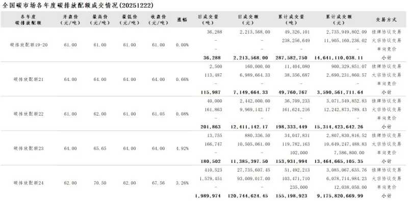 2025年1月1日至12月22日,全国碳市场碳排放配额成交量214,539,219吨,成交额13,153,854,063.84元。