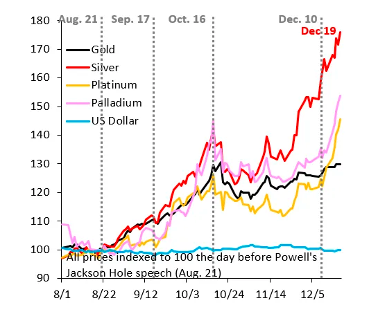 如下图所示,自今年8月美联储主办的杰克逊霍尔年会以来,短短四个月时间里白银价格飙升了76%,钯金大涨了65%,铂金涨幅也达到惊人的45%,而引发贵金属疯狂上涨的黄金近期倒是表现滞后——涨幅“仅”为30%。
