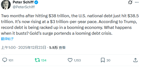 无独有偶。华尔街知名预言家彼得·希夫周二也在社交媒体上表示,美国联邦政府债务规模在突破38万亿美元两个月后,刚刚达到了38.5万亿美元——目前正以每年3万亿美元的速度增长。特朗普声称,创纪录的债务是在经济繁荣时期累积的。但一旦经济崩溃,将会发生什么?黄金价格的飙升正预示着一场迫在眉睫的债务危机。