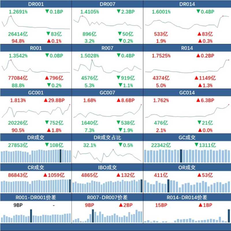 银行间质押式回购市场方面,多数品种小幅下跌,R014品种继续量价齐涨。具体看,DR001、R001加权平均利率分别下行0.1BP、持平,报1.2691%、1.3542%,成交额分别减少83亿元、增加796亿元;DR007、R007加权平均利率分别下行2.3BP、0.4BP,报1.4105%、1.5028%,成交额分别减少50亿元、919亿元;DR014、R014加权平均利率分别下行0.4BP、上行0.2BP,报1.6001%、1.7525%,成交额分别增加83亿元、1149亿元。