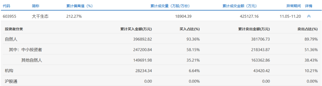 在个股方面,高位人气股持续走强,大千生态更是实现了13连板,粤桂股份也达到了9连板,东方精工、渤海股份等个股涨停。值得注意的是,大千生态在盘中多次打开涨停,全天成交16.86亿元,换手率高达37.77%。从资金面来看,主力资金今日净流出1.17亿元,本周以来主力资金合计净流出该股2.49亿元。散户是该股成交的主力军,其中中小投资者买入和卖出占比均超50%。
