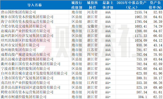 58家首次发行债券的城投中有50家披露了2025年中报数据,截至2025年半年度末,这些城投的平均总资产规模约510亿元,最大2155亿元。在资产规模居前的主体中,不乏一些知名城投平台,如唐山国控集团有限公司、桐乡市国有资本控股集团有限公司、海宁市国有资本投资运营有限公司、合肥市轨道交通集团有限公司等。