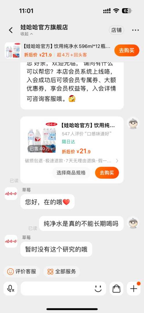 娃哈哈客服对此回应称,关于长期饮用纯净水的利弊,科学界尚存争议。而农夫山泉官方旗舰店客服则表示,纯净水因缺少矿物质,长期饮用可能影响健康,但若通过其他食物补充矿物质,则无需过分担忧。