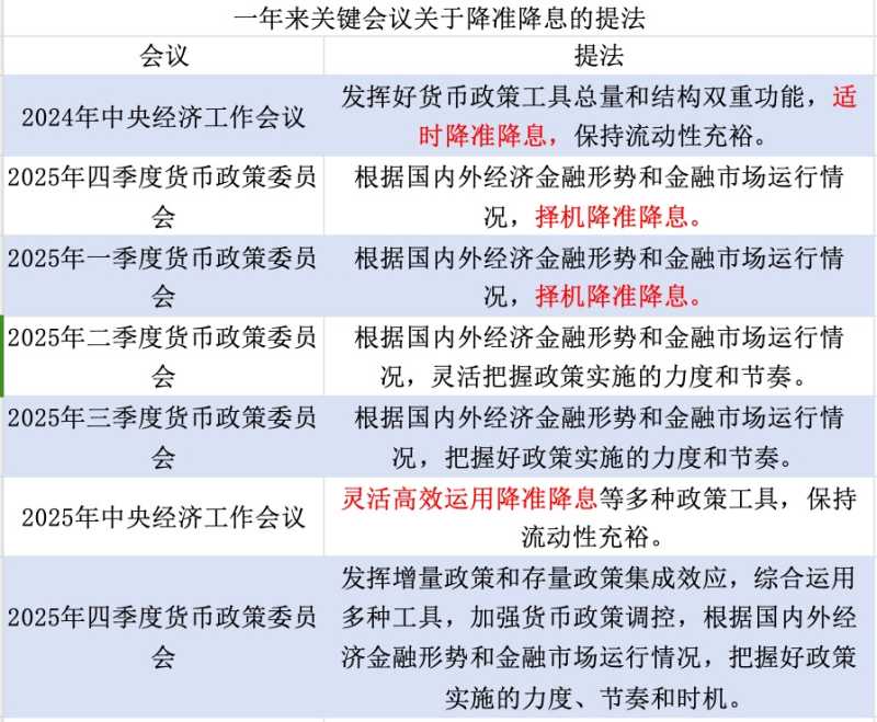 明年一季度降准降息概率较低。据会议定调,促进社会综合融资成本低位运行,未直接提及降准降息。