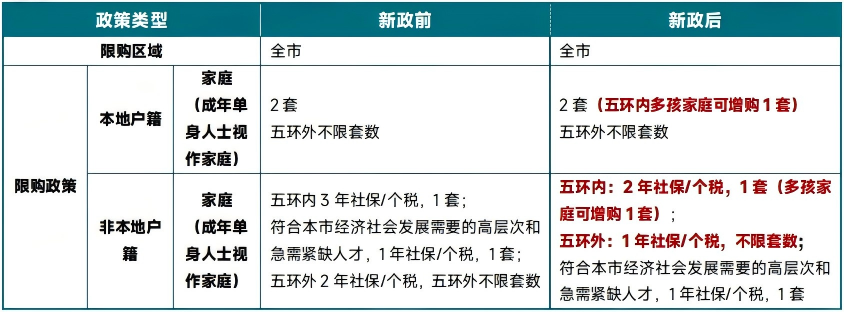 此次北京住房限购政策再次调整。一是放宽非京籍家庭购房条件。将非京籍家庭购买五环内商品住房的社保或个税缴纳年限,由现行的“3年”调减为“2年”;购买五环外商品住房的,由现行的“2年”调减为“1年”。二是支持多子女家庭住房需求。二孩及以上的多子女家庭,可在五环内多购买一套商品住房,即:京籍多子女家庭,可在五环内购买3套商品住房;在京连续2年缴纳社保或个税的非京籍多子女家庭,可在五环内购买2套商品住房。