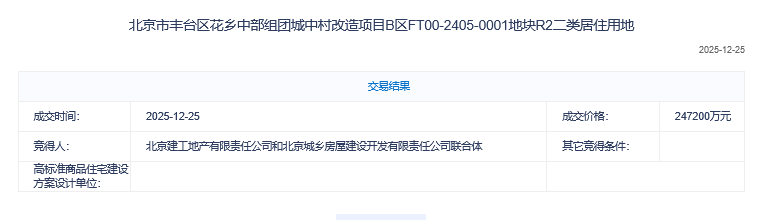 12月25日,丰台区花乡街道0001地块(下称“花乡地块”)以平淡收场,为2025年北京土地市场画上句号。该地块由北京建工联合城乡开发以底价24.72亿元斩获,成交楼面价4.2万元/平方米。
