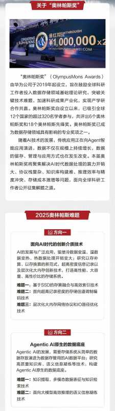 华为发布的海报显示,奥林帕斯奖"(OlympusMons Awards) 由华为公司于2019年起设立,旨在鼓励全球科研工作者投入数据存储领域基础理论研究,突破关键技术难题,加速科研成果产业化,实现产学研合作共赢。奥林帕斯奖自设立以来,已吸引全球12个国家的超过320名学者参与,共评出6个奥林帕斯奖和18个奥林帕斯先锋奖。奥林帕斯奖已成为数据存储领域具有影响的专业奖项之一。